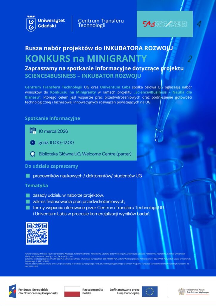 Centrum Transferu Technologii UG oraz Univentum Labs –Spółka Celowa UG ogłaszają nabór wniosków do KONKURSU na MINIGRANTY w ramach projektu „Science4Business – Nauka dla Biznesu/INKUBATOR ROZWOJU”. Celem konkursu jest wsparcie prac przedwdrożeniowych oraz podniesienie gotowości technologicznej i biznesowej innowacyjnych rozwiązań powstających na Uniwersytecie Gdańskim.